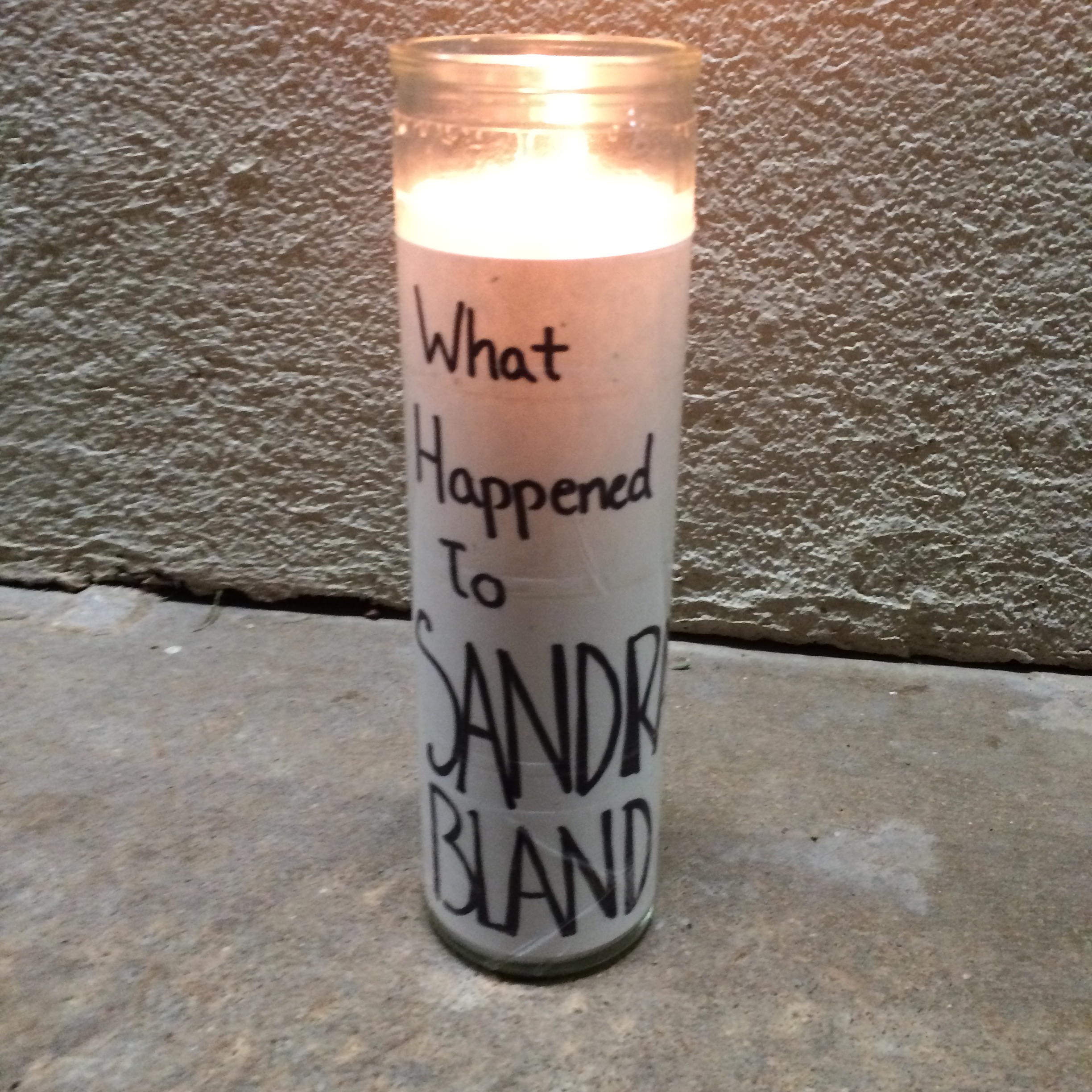 “She’s going to light it again!” voices began calling to each other from the pitch darkness that surrounded us. The neighbors must have been watching. We had no way of knowing if they were friend or foe. I bent close, struck the match, and watched the wick glow out its strong but powerful statement once again: “What happened to Sandra Bland?”
